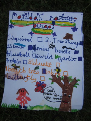 A 3 year old will probably have a maximum of 6 items on their sheet.  It may include general items like ‘a blue flower’, ‘a flying bird’ etc.  While an older child may have more specific items such as ‘wild garlic’ , or ‘a yew tree’ (depending on their knowledge).