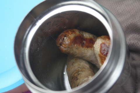 I had also cooked some sausages and stored them in the food flask. What a treat to eat steaming hot sausages on our picnic! It worked perfectly. My only criticism would be that the extra compartment in the lid holding a folding plastic spoon is unnecessary and I found I had to undo this compartment before I could get a good grip on the lid to open it. Piping hot sausages fab though! Very useful if you have kids who aren’t really into sandwiches.